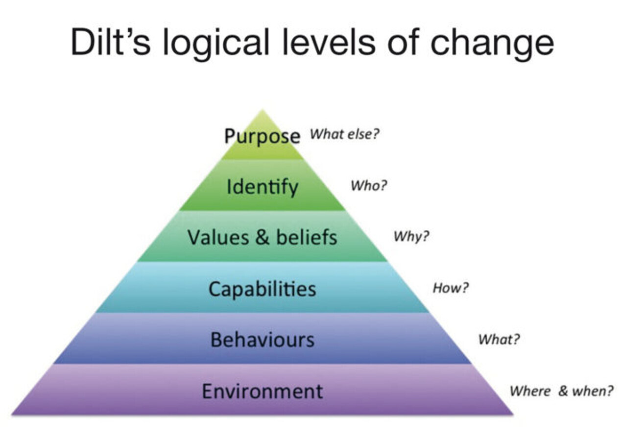 Rozpoczynając ten proces zmiany mojego sposobu myślenia, użyłem modelu o nazwie logiczne poziomy zmian Diltsa. Ten sprawdzony model został opracowany w latach 70. XX wieku przez międzynarodowego eksperta w dziedzinie przywództwa i zarządzania zmianą Roberta Diltsa i jest oparty na pracy naukowca i filozofa Gregory'ego Batesona. Model pomaga nam zrozumieć różne poziomy, na których doświadczamy naszego świata. Poziomy to środowisko, zachowanie, możliwości i kompetencje, wartości i przekonania, tożsamość i cel (ryc. 1).
