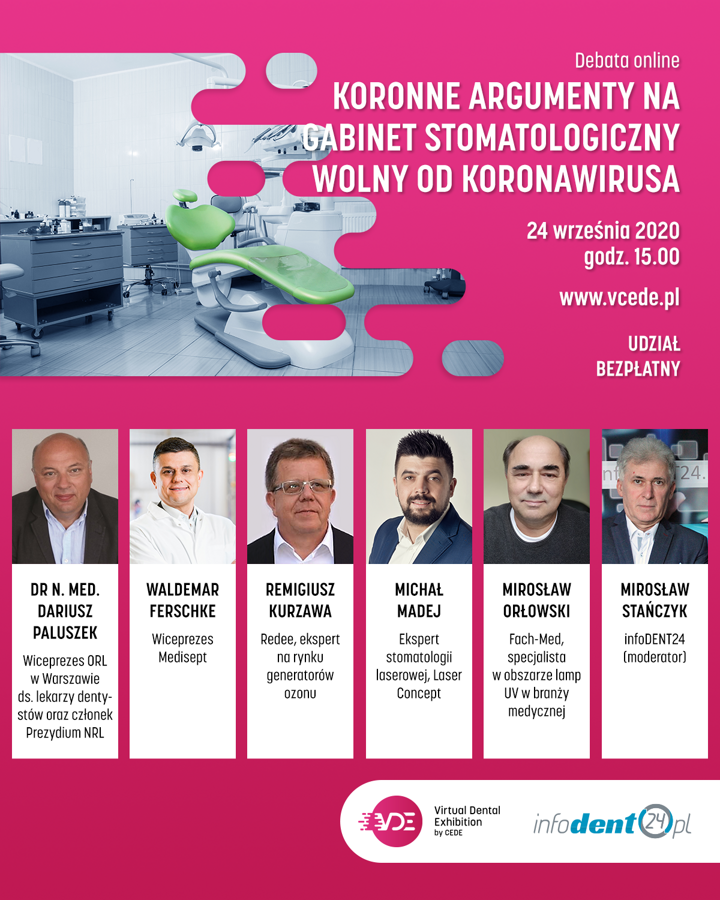 Ekspertami sesji „Koronne argumenty na gabinet stomatologiczny wolny od koronawirusa” będą m.in.: » lekarz epidemiolog Waldemar Ferschke wiceprezes Laboratorium Medisept, » Remigiusz Kurzawa Redee, ekspert na rynku generatorów ozonu, » Michał Madej, ekspert stomatologii laserowej, Laser Concept, » Mirosław Orłowski Fach-Med, specjalista w obszarze lamp UV w branży medycznej, » dr n. med. Dariusz Paluszek, wiceprezes ORL w Warszawie ds. lekarzy dentystów oraz członek Prezydium NRL.