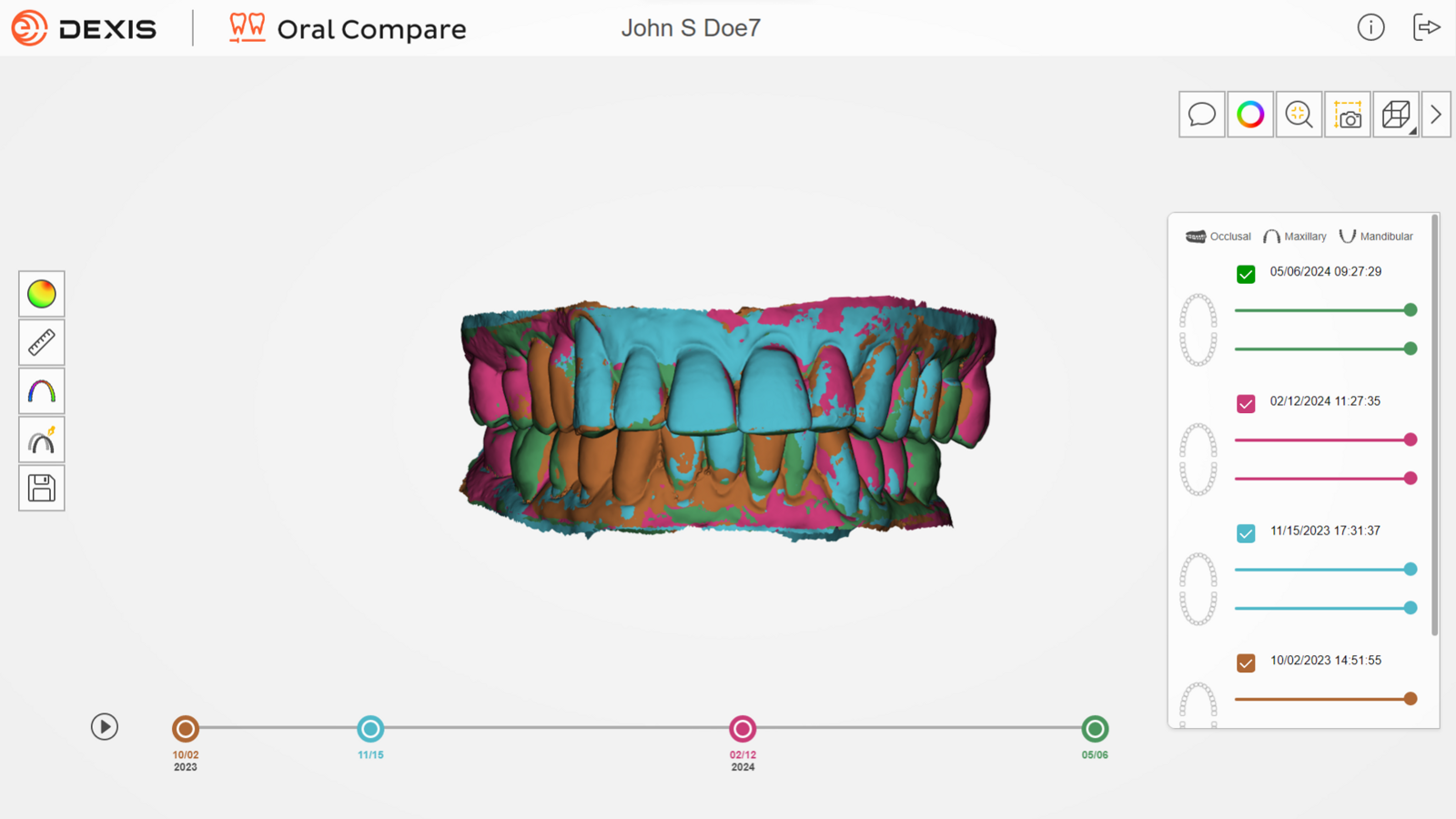 Aby intensywniej wspierać proaktywną opiekę stomatologiczną podczas rutynowych wizyt, najnowsza wersja DEXIS IS ScanFlow została wyposażona w funkcję Oral Compare. To nowe narzędzie pozwala Tobie i Twojemu pacjentowi łatwo i szybko wizualizować zmiany w stanie uzębienia na przestrzeni czasu. Najnowsza aktualizacja IS ScanFlow umożliwia szybkie rejestrowanie skanów pełnych łuków, a następnie nałożenie ich na siebie w celu uzyskania pełniejszego obrazu anatomii. Istnieje także możliwość wygenerowania kolorowych map, które ilustrują zmiany w jamie ustnej pacjenta.