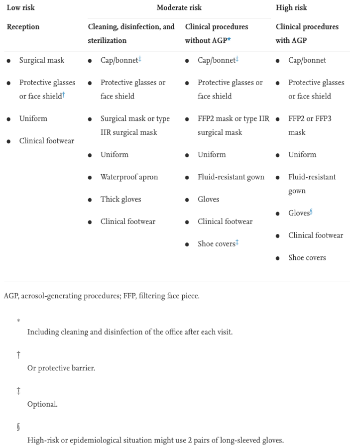 Dobór środków ochrony indywidualnej zależy bezpośrednio od lokalnych warunków epidemiologicznych, cech pacjenta i poziom ryzyka planowanych zabiegów (niskie, umiarkowane, wysokie).